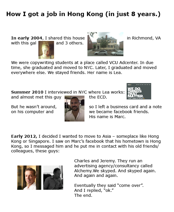 • Short version: NYC creative director connected me with some dudes in HK he knows. We skyped. They gave me a job. Now I’m in HK.